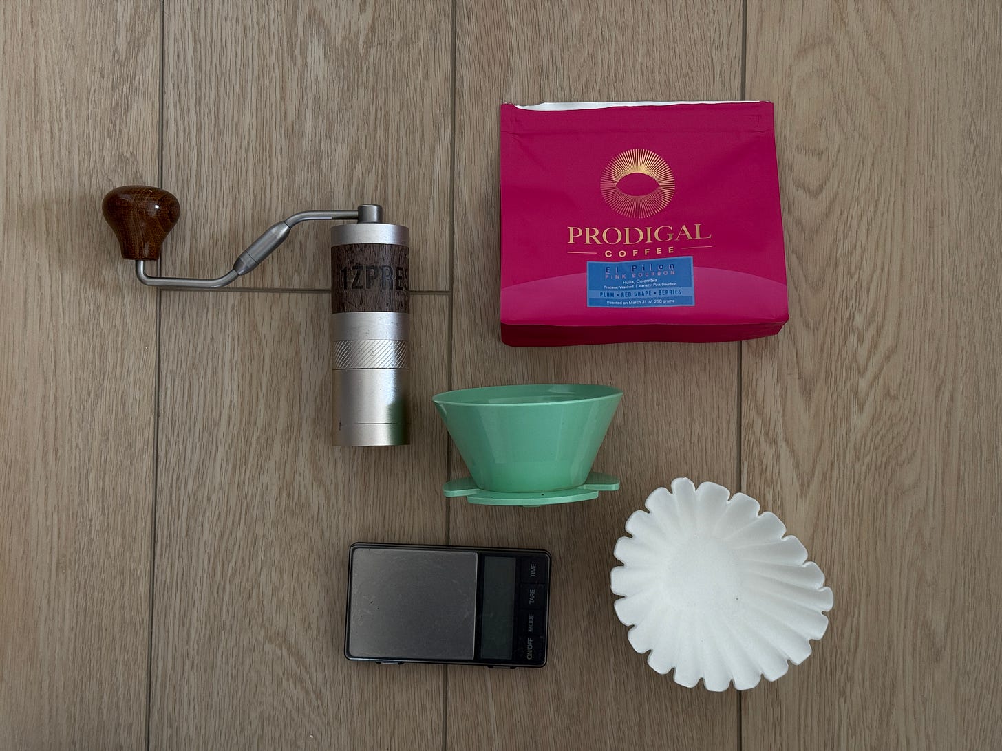 My travel coffee setup includes a small hand grinder, an April Coffee Brewer, paper filters, a mini travel scale, and whatever beans I’m into at the moment. Often I leave space in my bag so I can buy fun local roasts wherever I land.