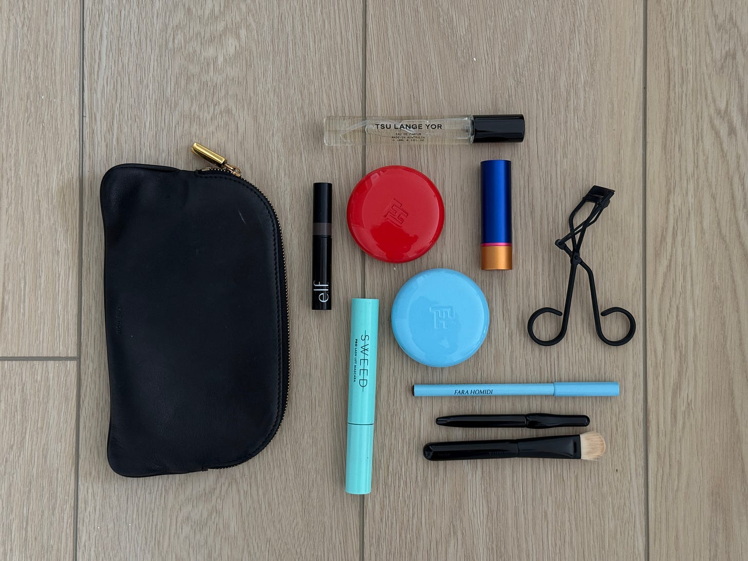 Next up: a small leather pouch where I stash a few basic makeup items for when I want to feel slightly more human before landing.