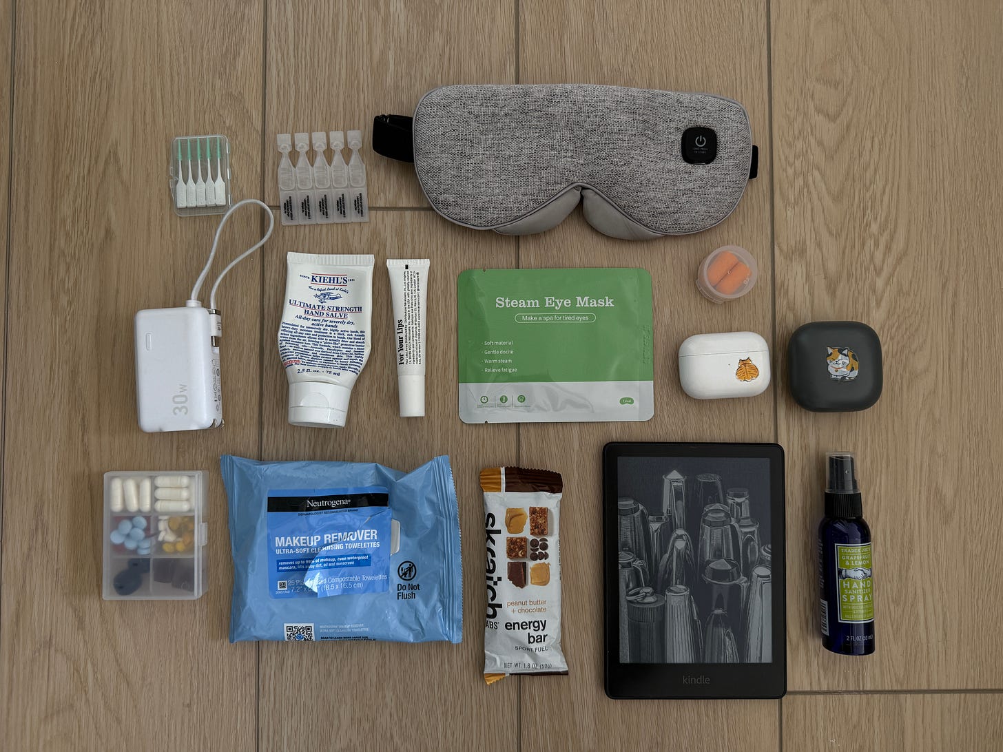 Some of these are obvious, some might be a little extra, but all of them have earned their spot. Whether it’s a daytime hop or a brutal red-eye, this is the stuff that gets me through and not totally falling apart by the time I land.