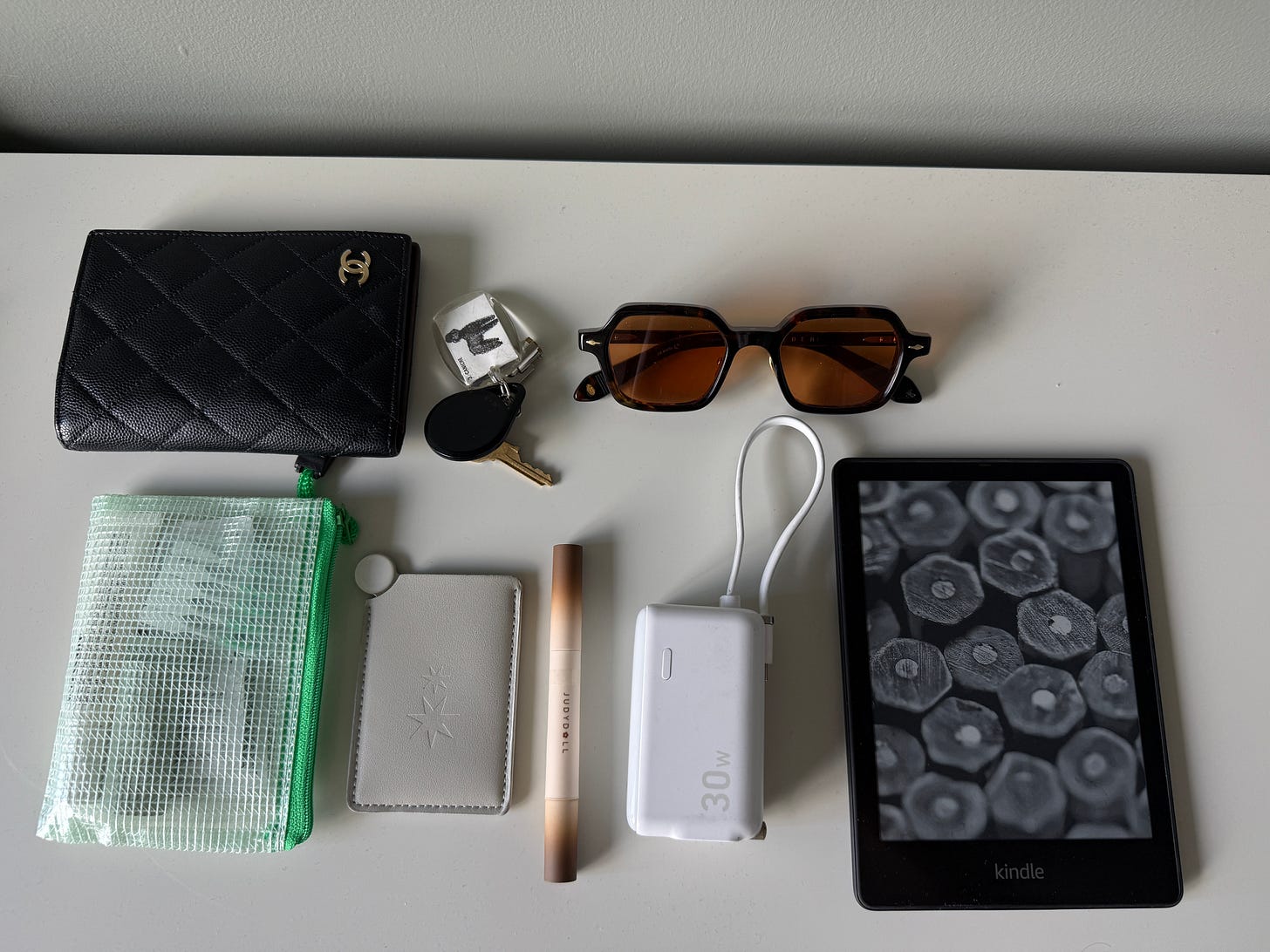 Fits a surprisingly decent amount of stuff without losing its shape. Below is a snapshot of everything I can comfortably carry in it, with room to spare.