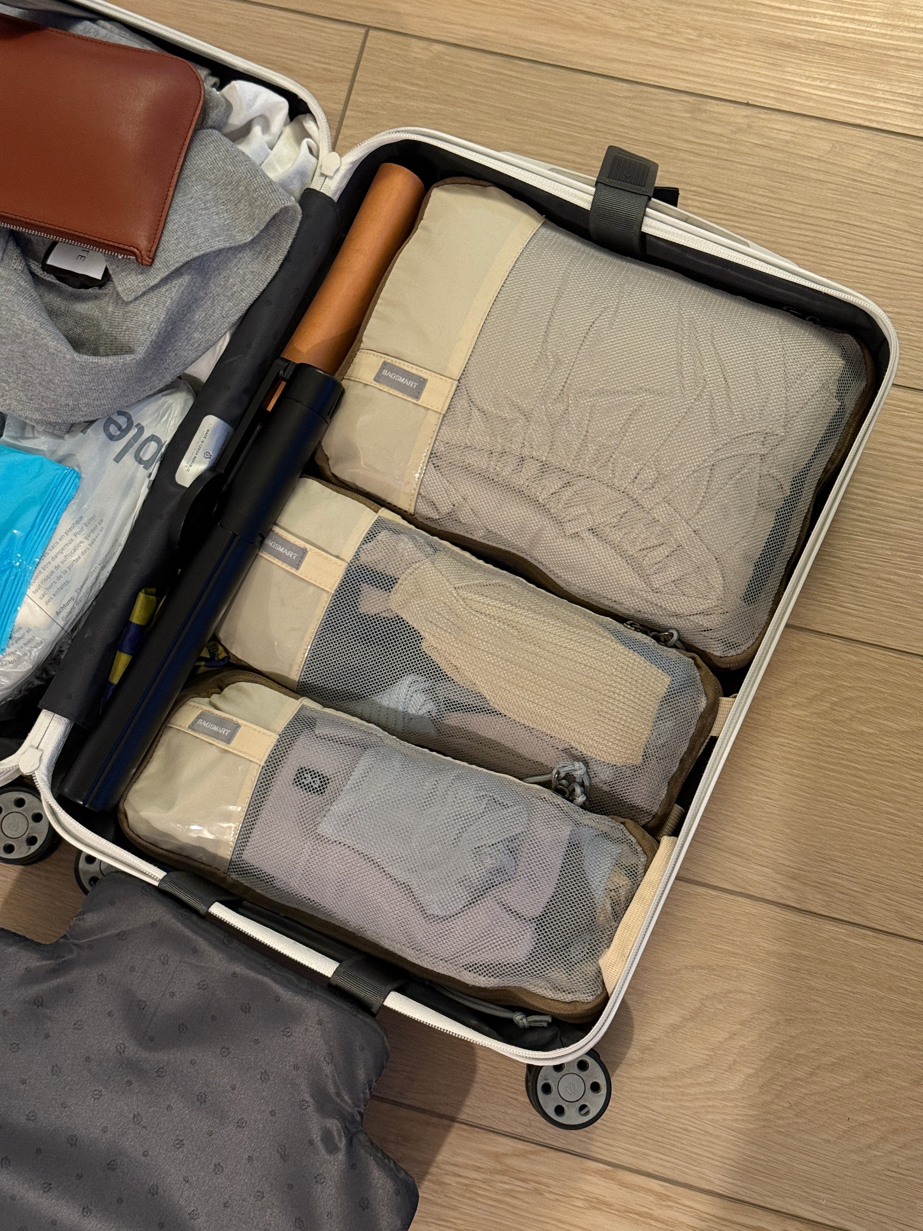 On the return trip, I designate one or two cubes specifically for dirty laundry, which keeps everything neatly separated instead of turning the suitcase into a chaotic pile of worn clothing.
